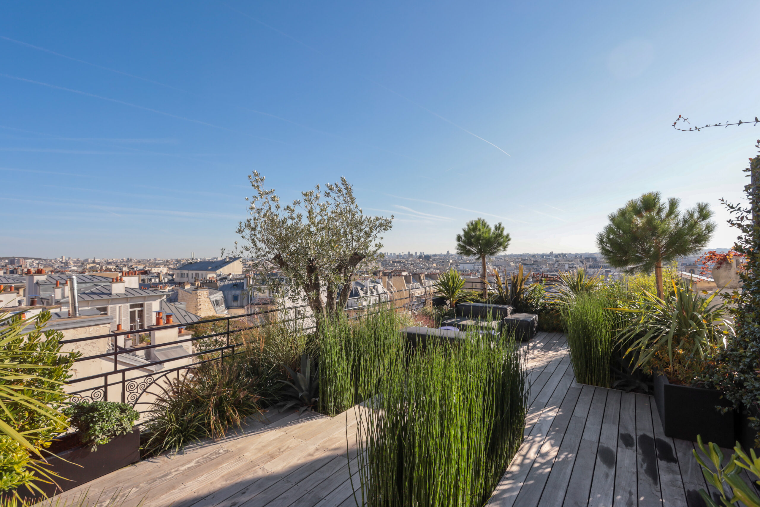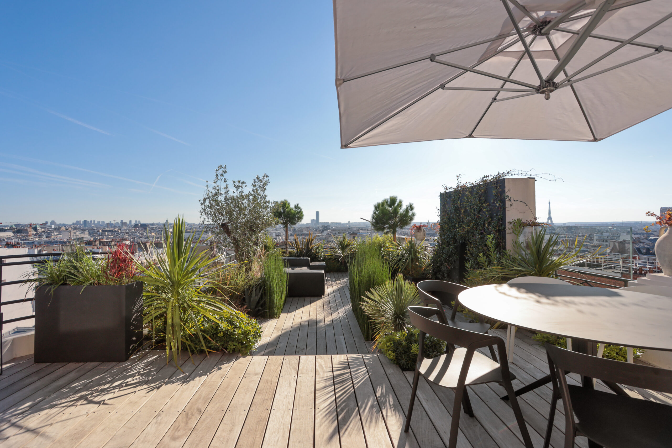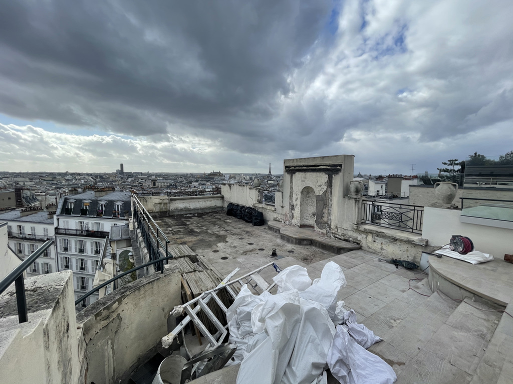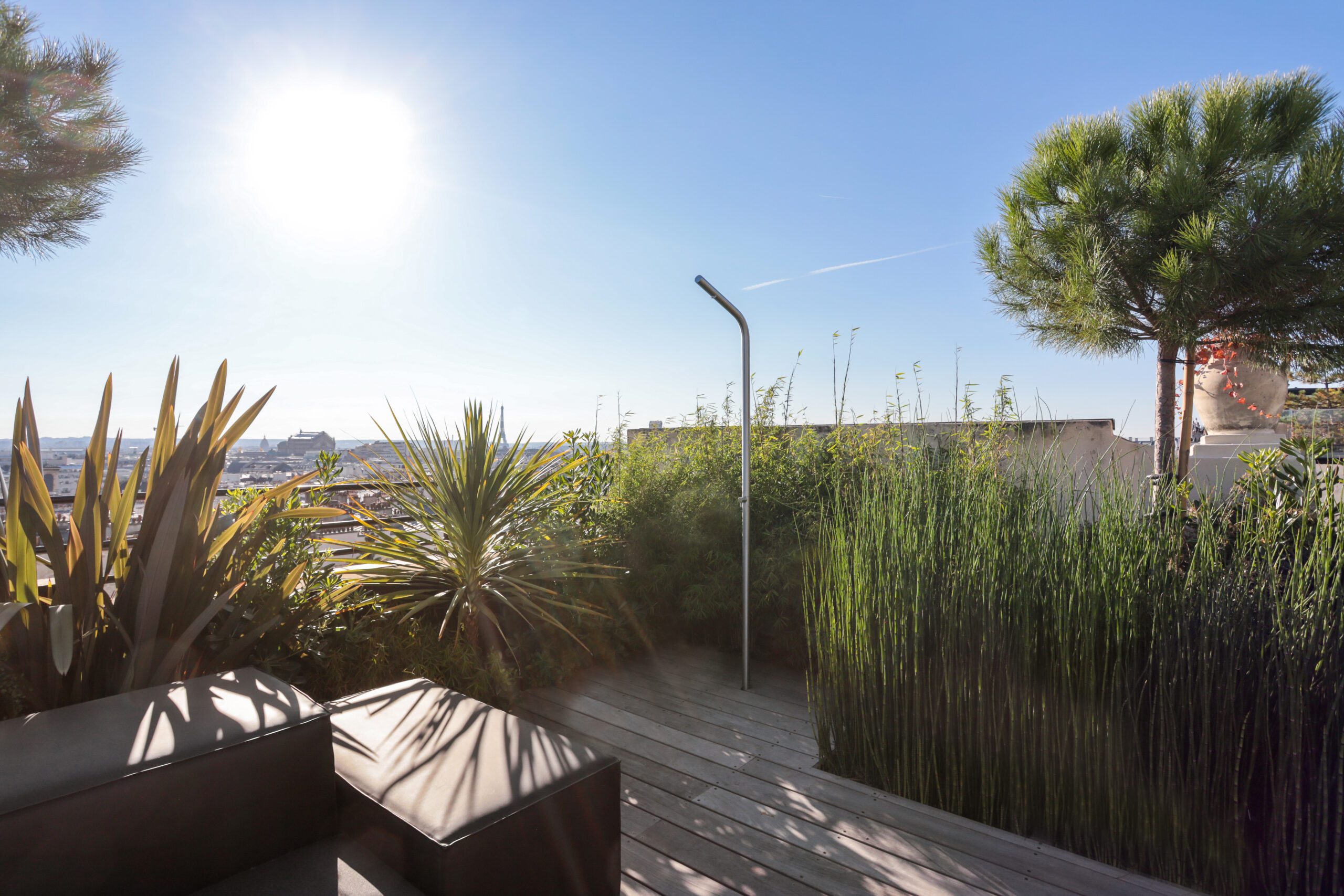 Ce projet de toit-terrasse au cœur de Paris a été conçu comme un véritable jardin suspendu, en réponse à la volonté du client de créer une terrasse dédiée à la détente et à l’accueil, pensée pour une famille de quatre personnes, tout en restant ouverte aux moments de partage avec la famille et les amis. Lors de la découverte du site, le toit se trouvait dans un état très dégradé, nécessitant une reprise complète de l’existant. Le projet a donc débuté par des travaux techniques majeurs, comprenant la réfection de l’étanchéité, le ravalement, la création des réseaux de plomberie, ainsi que la mise en œuvre d’un aménagement paysager intégral. Un jardin suspendu conçu malgré de fortes contraintes techniques L’un des principaux défis a consisté à transformer une surface minérale en un espace végétalisé vivant, tout en respectant les contraintes structurelles propres aux toitures-terrasses parisiennes. Afin de recréer une sensation de jardin de pleine terre, des enclaves végétales ont été intégrées directement dans le sol. Toutefois, la faible profondeur disponible a imposé la plantation des arbres en bacs paysagers de grand volume, spécialement dimensionnés pour assurer leur développement tout en préservant la structure du bâtiment. Des espaces de vie extérieurs pensés comme une extension de l’habitat La terrasse a été pensée comme une véritable extension de l’espace de vie intérieur, organisée autour d’espaces dédiés à la détente, à la convivialité et à l’accueil. Elle accueille une salle à manger extérieure, un salon d’extérieur confortable et une douche extérieure, offrant une expérience unique de rafraîchissement face à la Tour Eiffel. Une solution d’ombrage par parasol a été intégrée afin de garantir un confort optimal lors des périodes estivales, tout en préservant les perspectives et les vues exceptionnelles sur Paris. Préserver les vues tout en créant un cocon végétal La conception paysagère a relevé un enjeu majeur : préserver une vue imprenable sur la quasi-totalité de Paris, tout en créant un écrin végétal intime, propice au repos et à la réception. Le travail sur les hauteurs, les masses et les densités de plantations a permis de structurer les espaces, de cadrer certaines perspectives et de filtrer les vis-à-vis, tout en conservant une grande ouverture visuelle. La palette végétale a été soigneusement sélectionnée afin d’assurer une présence végétale toute l’année, avec des feuillages persistants et des volumes capables de créer de véritables espaces intérieurs paysagers sur la terrasse. Confort, ambiances et usages jour et nuit Le confort d’usage a également été renforcé par l’intégration discrète d’un sound system extérieur, pensé pour accompagner les moments de détente et de convivialité sans nuire à l’environnement urbain ni au voisinage. Un éclairage paysager subtil a été conçu afin de mettre en valeur la terrasse à la nuit tombée, souligner les cheminements et révéler certains végétaux structurants, créant des ambiances chaleureuses et maîtrisées en cohérence avec l’esprit du projet. Une expertise spécifique des toitures-terrasses parisiennes Enfin, l’accès spécifique au site, particulièrement contraint, a constitué un défi à part entière. L’acheminement des matériaux, la manutention des bacs, la gestion des charges et la coordination des différents corps de métier ont nécessité une expertise technique et logistique pointue, propre aux chantiers de toitures-terrasses à Paris. Cette maîtrise a été un élément déterminant dans la réussite du projet.