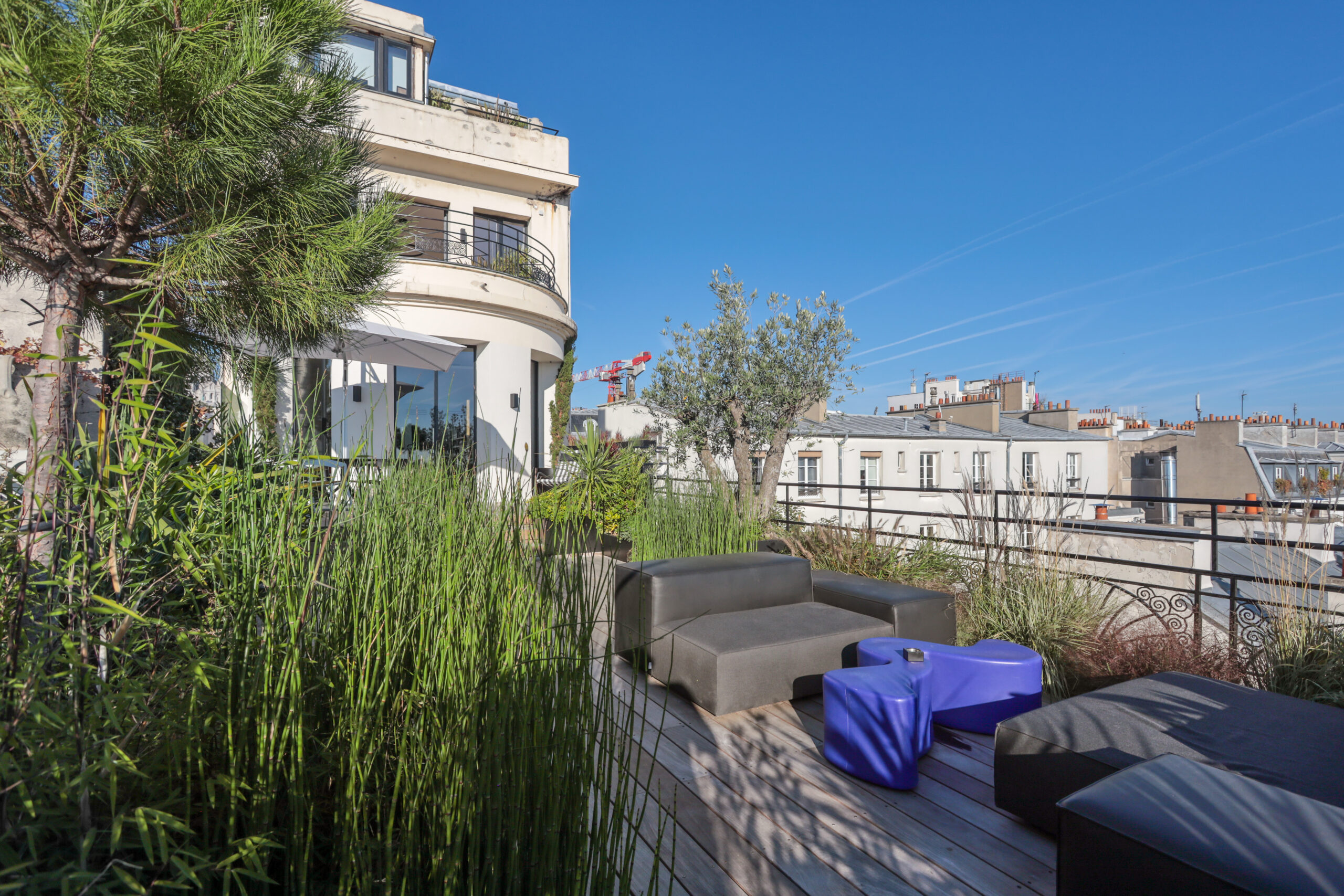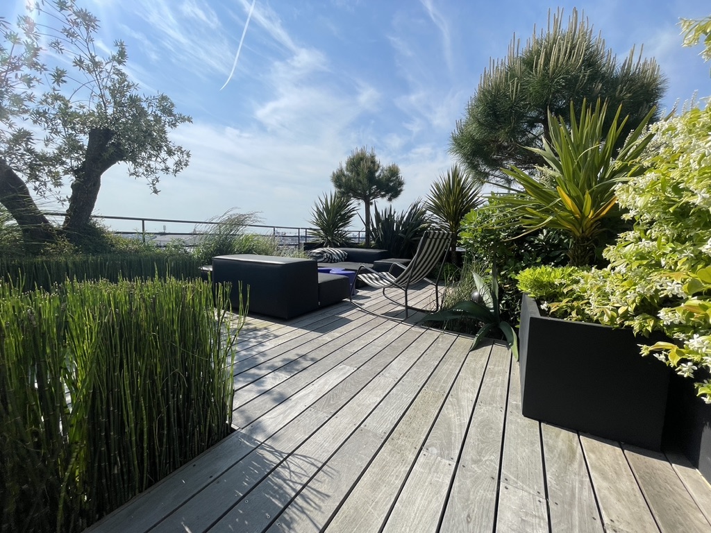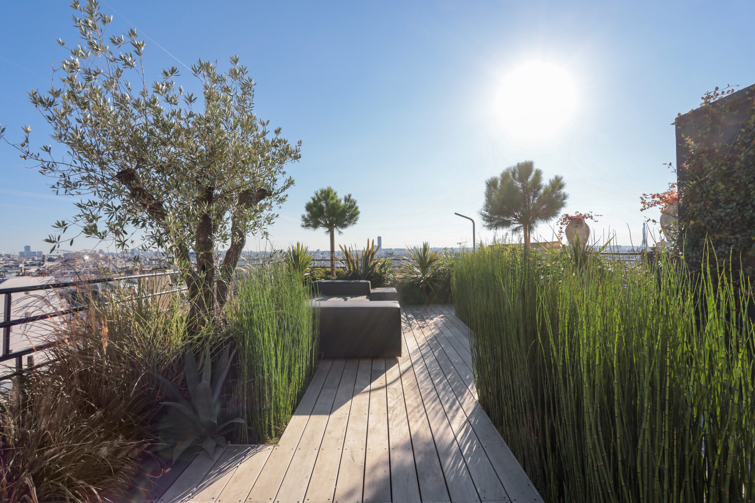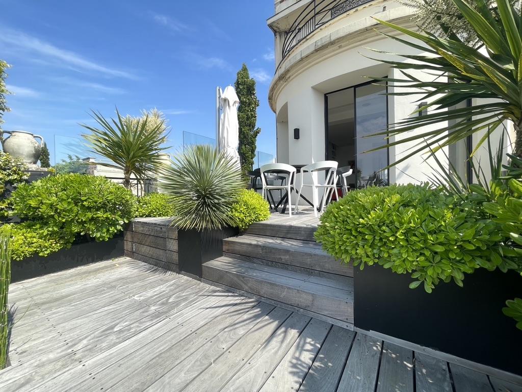 Ce projet de toit-terrasse au cœur de Paris a été conçu comme un véritable jardin suspendu, en réponse à la volonté du client de créer une terrasse dédiée à la détente et à l’accueil, pensée pour une famille de quatre personnes, tout en restant ouverte aux moments de partage avec la famille et les amis. Lors de la découverte du site, le toit se trouvait dans un état très dégradé, nécessitant une reprise complète de l’existant. Le projet a donc débuté par des travaux techniques majeurs, comprenant la réfection de l’étanchéité, le ravalement, la création des réseaux de plomberie, ainsi que la mise en œuvre d’un aménagement paysager intégral. Un jardin suspendu conçu malgré de fortes contraintes techniques L’un des principaux défis a consisté à transformer une surface minérale en un espace végétalisé vivant, tout en respectant les contraintes structurelles propres aux toitures-terrasses parisiennes. Afin de recréer une sensation de jardin de pleine terre, des enclaves végétales ont été intégrées directement dans le sol. Toutefois, la faible profondeur disponible a imposé la plantation des arbres en bacs paysagers de grand volume, spécialement dimensionnés pour assurer leur développement tout en préservant la structure du bâtiment. Des espaces de vie extérieurs pensés comme une extension de l’habitat La terrasse a été pensée comme une véritable extension de l’espace de vie intérieur, organisée autour d’espaces dédiés à la détente, à la convivialité et à l’accueil. Elle accueille une salle à manger extérieure, un salon d’extérieur confortable et une douche extérieure, offrant une expérience unique de rafraîchissement face à la Tour Eiffel. Une solution d’ombrage par parasol a été intégrée afin de garantir un confort optimal lors des périodes estivales, tout en préservant les perspectives et les vues exceptionnelles sur Paris. Préserver les vues tout en créant un cocon végétal La conception paysagère a relevé un enjeu majeur : préserver une vue imprenable sur la quasi-totalité de Paris, tout en créant un écrin végétal intime, propice au repos et à la réception. Le travail sur les hauteurs, les masses et les densités de plantations a permis de structurer les espaces, de cadrer certaines perspectives et de filtrer les vis-à-vis, tout en conservant une grande ouverture visuelle. La palette végétale a été soigneusement sélectionnée afin d’assurer une présence végétale toute l’année, avec des feuillages persistants et des volumes capables de créer de véritables espaces intérieurs paysagers sur la terrasse. Confort, ambiances et usages jour et nuit Le confort d’usage a également été renforcé par l’intégration discrète d’un sound system extérieur, pensé pour accompagner les moments de détente et de convivialité sans nuire à l’environnement urbain ni au voisinage. Un éclairage paysager subtil a été conçu afin de mettre en valeur la terrasse à la nuit tombée, souligner les cheminements et révéler certains végétaux structurants, créant des ambiances chaleureuses et maîtrisées en cohérence avec l’esprit du projet. Une expertise spécifique des toitures-terrasses parisiennes Enfin, l’accès spécifique au site, particulièrement contraint, a constitué un défi à part entière. L’acheminement des matériaux, la manutention des bacs, la gestion des charges et la coordination des différents corps de métier ont nécessité une expertise technique et logistique pointue, propre aux chantiers de toitures-terrasses à Paris. Cette maîtrise a été un élément déterminant dans la réussite du projet.